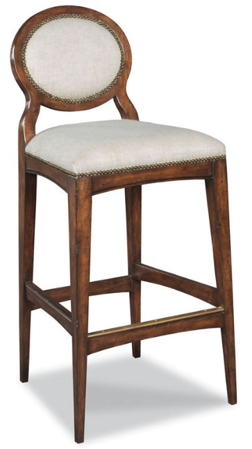 A sleek design with gracefully tapered legs joined by low stretchers and curved apron rails. The stool features an upholstered seat and back and is finished with a nail head trim.Read More